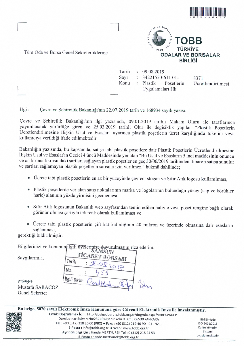 Türkiye Odalar ve Borsalar Birliğinin 09.08.2019 tarih ve 34221550-611.01-8371 sayılı yazısı.