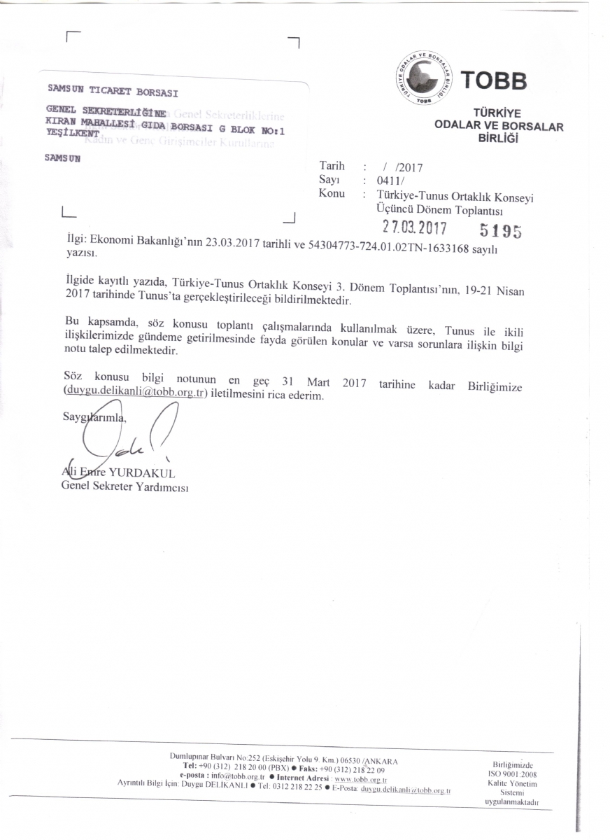Türkiye Odalar ve Borsalar Birliğinin 27.03.2017 tarih ve 0411/5195 sayılı yazısı