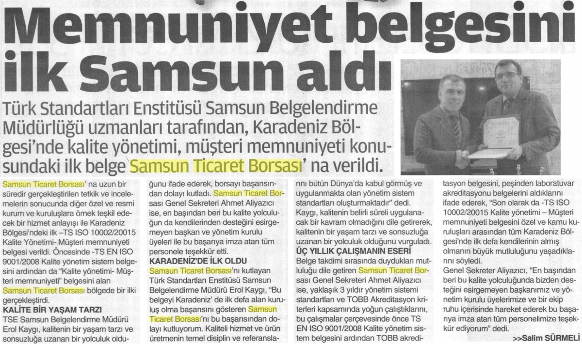 Memnuniyet Belgesini İlk Samsun Aldı