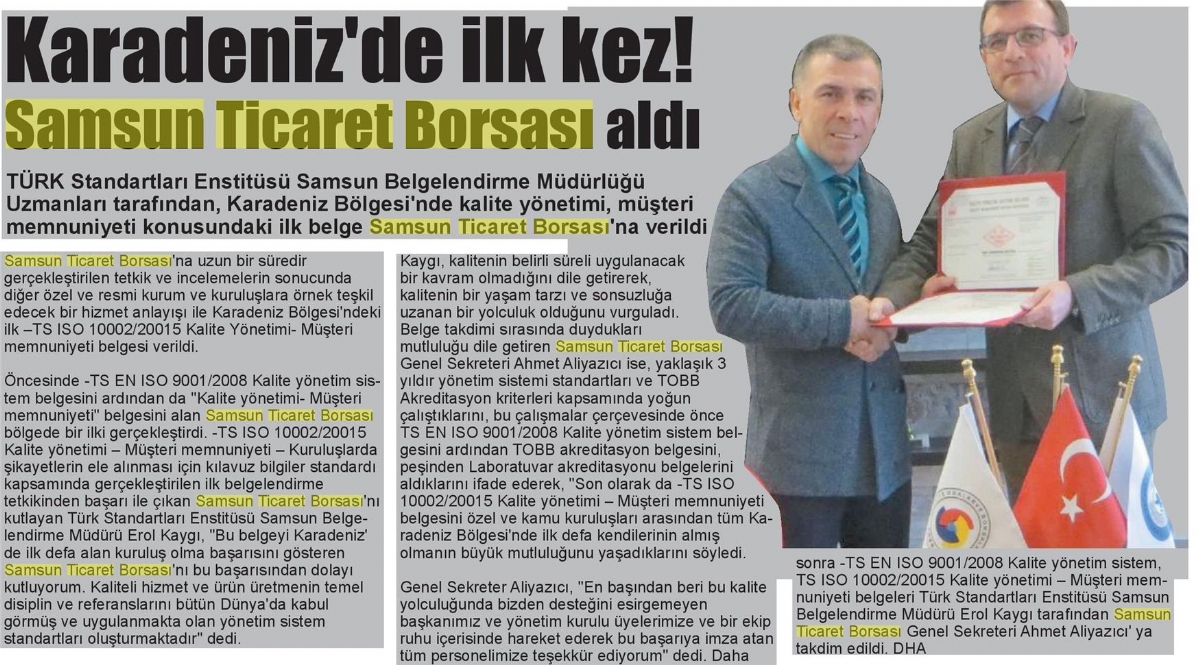 Karadeniz Bölgesi'ndeki İlk TS ISO 10002/20015 Kalite Yönetimi Müşteri Memnuniyeti Belgesi